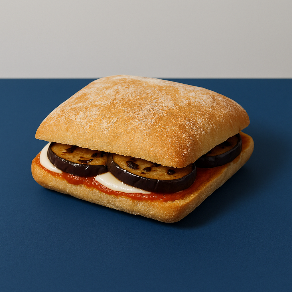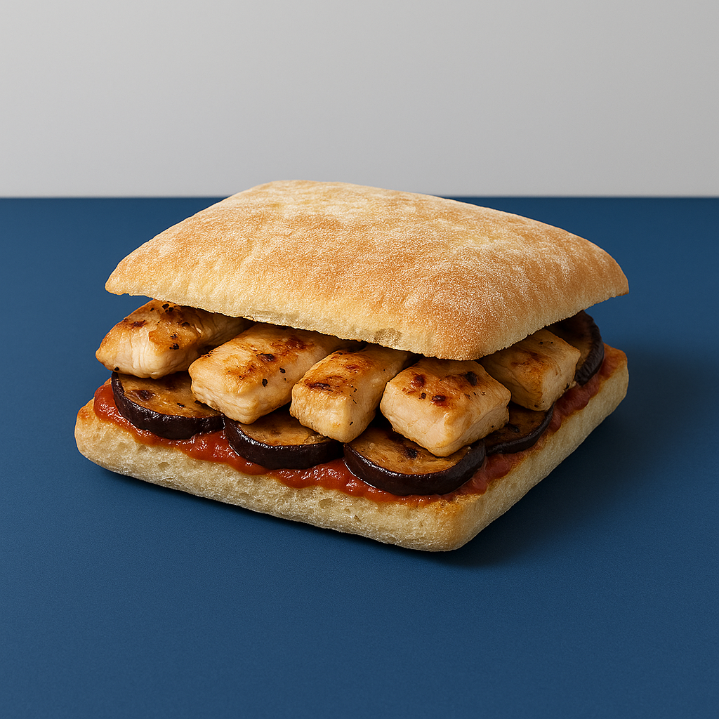 یک نفره، ۱۰۰ گرم مرغ گریل شده، بادمجان گریل شده، سس مارینارا، نان چاباتا