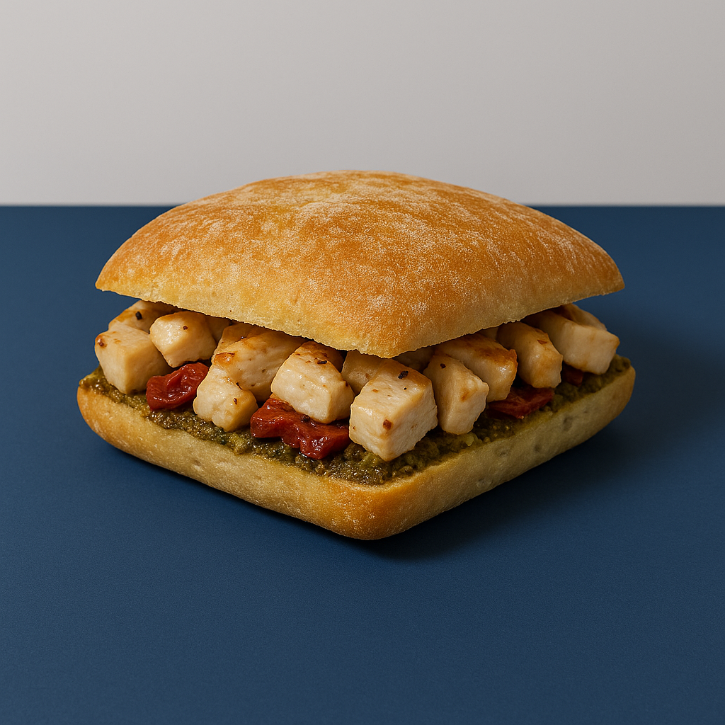 نان چاباتا، ۱۳۰ گرم مرغ گریل مرینیت شده، سس پستو، گوجه خشک، روغن زیتون