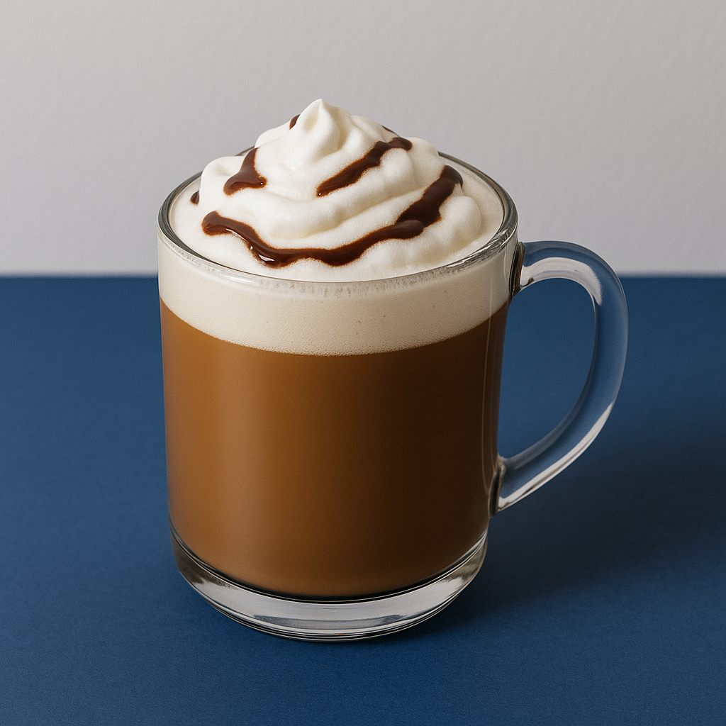 ۵۰ میلی لیتر، قهوه عصاره گیری شده، ۷۰% عربیکا، ۳۰% روبوستا، دم شده با دستگاه اسپرسو ساز به همراه شیر فوم گیری شده و سس شکلات